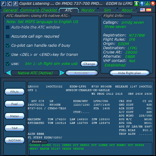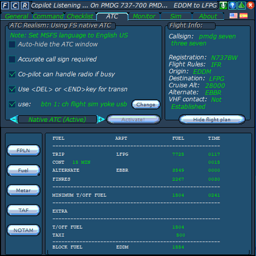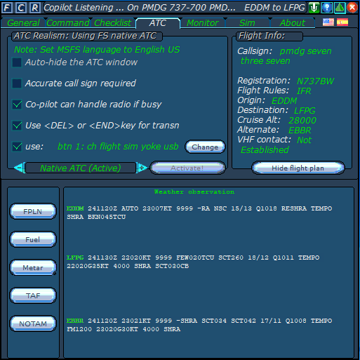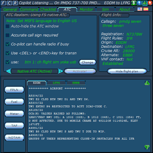 The ATC page, for selecting the options you think are better for you. Note the possibility of using a joystick button, as a push to talk button, for message transmission. So, it is time to get away fom those bad habits, of reaching out for the keyboard to interact with ATC!